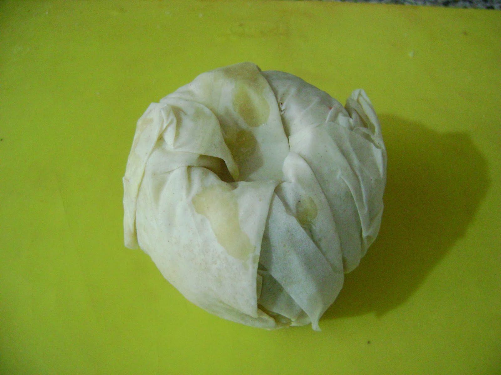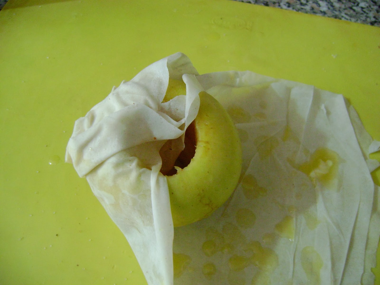 Хващаме един по един краищата на листа и обгръщаме ябълката като ги подпъхваме в отвора.