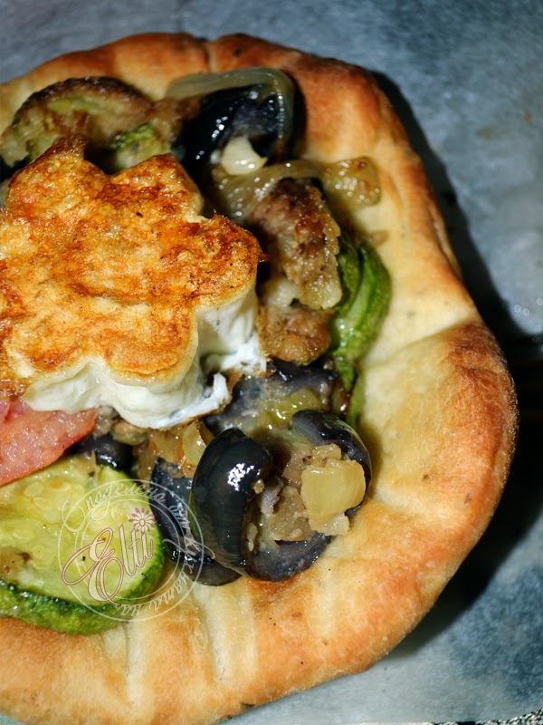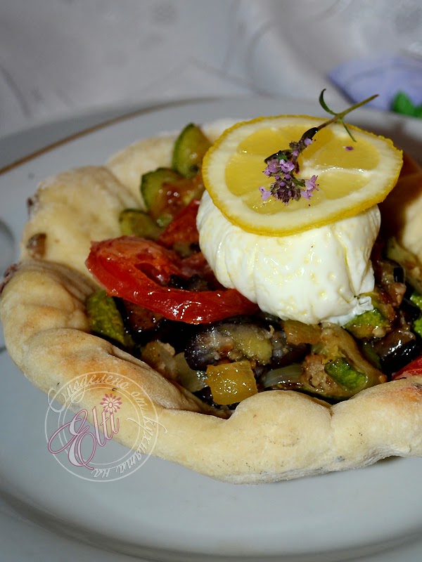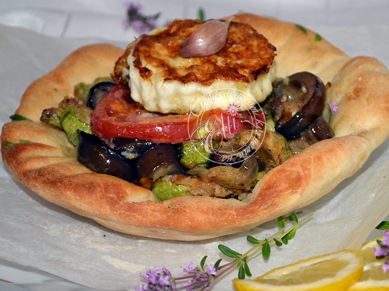 Сложете в хлебните панички малко от зеленчуковия микс, резен домат, пак зеленчуков микс, пак домат и най-отгоре пържено яйце.