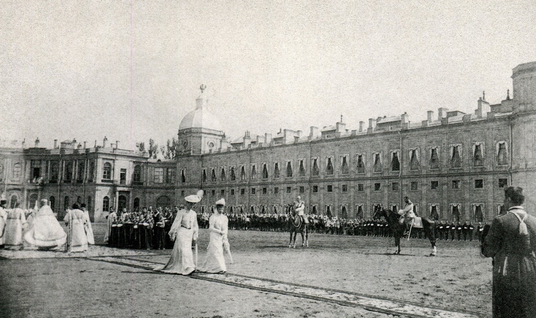 Шеф полка вдовствующая императрица Мария Федоровна и император Николай II (в центре) принимают парад кирасир на плацу перед Гатчинским дворцом