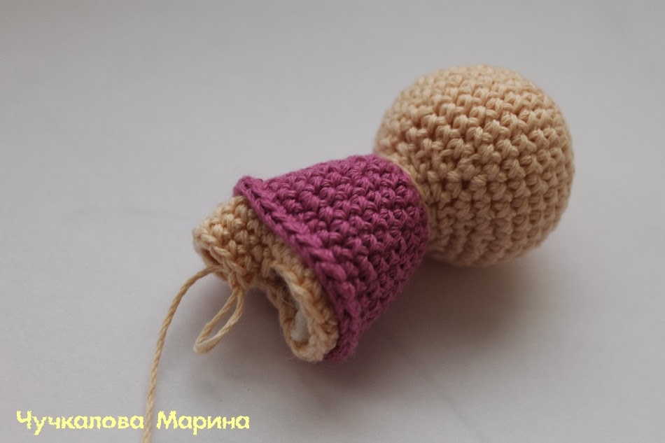 27) Вяжем 12 сбн. и складываем пополам, как бы разделив туловище на две части (ножки) и вяжем по кругу ножку, состоящую из 12 петель.