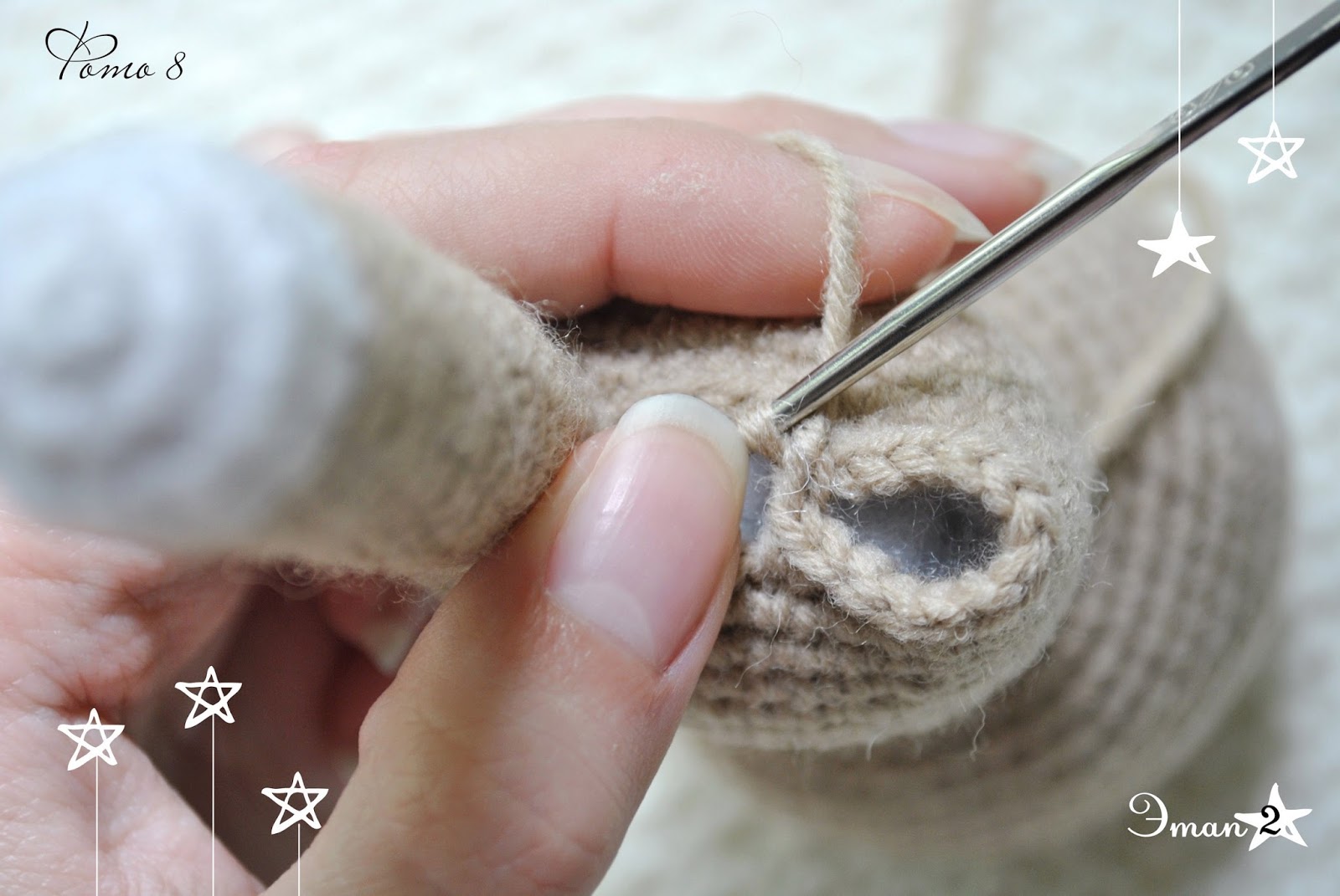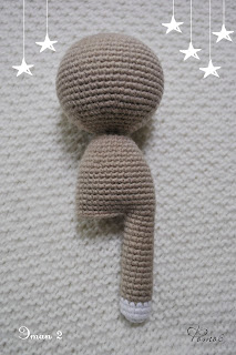 Далее нужно связать вторую. Для этого мы отсчитываем 4 петли от предыдущей ножки (фото 7) и отмечаем начало ножки. Вводим крючок, провязываем 14 сбн и затем возвращаемся в начало ряда (фото 8). Получился маленький круг. Затем вяжем ножку аналогично первой, по описанию, приведенному выше.