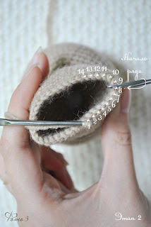 После того, как деталь основным цветом связана, нить не обрезаем, складываем 1 деталь дополнительного цвета и 1 деталь основного и продолжаем вязать захватывая петли обеих деталей, обвязывыем основание ушек, затем по описанию (на схеме подписано обвязка):