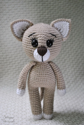 При указанных размерах пряжи и крючка кошечка получилась 20 сантиметров в высоту вместе с ушками.
