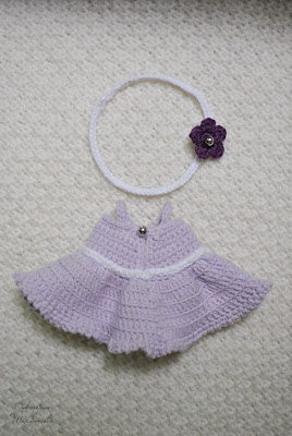 Поясок, лямочки и повязочку я вязала так: набирала цепочку вп нужной длины, затем со 2 петли от крючка сс до конца цепочки. Поясок и лямочки пришить к платью, повязочку замкнуть в кольцо.