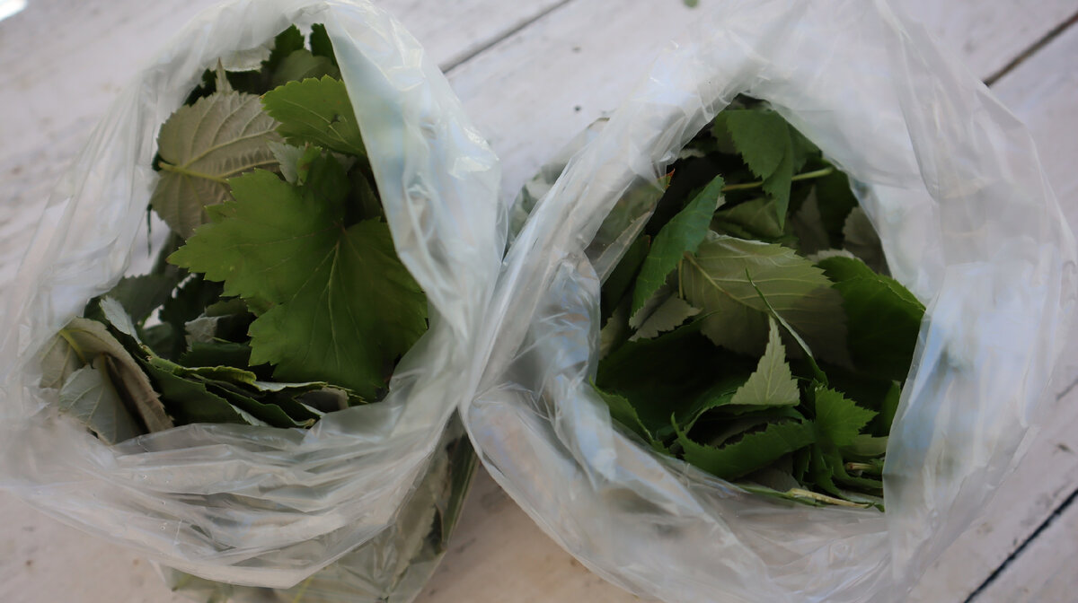 С куста собрать верхние молоденькие листочки, у меня это веточки малины, пахучей черной смородины и немного вишни.