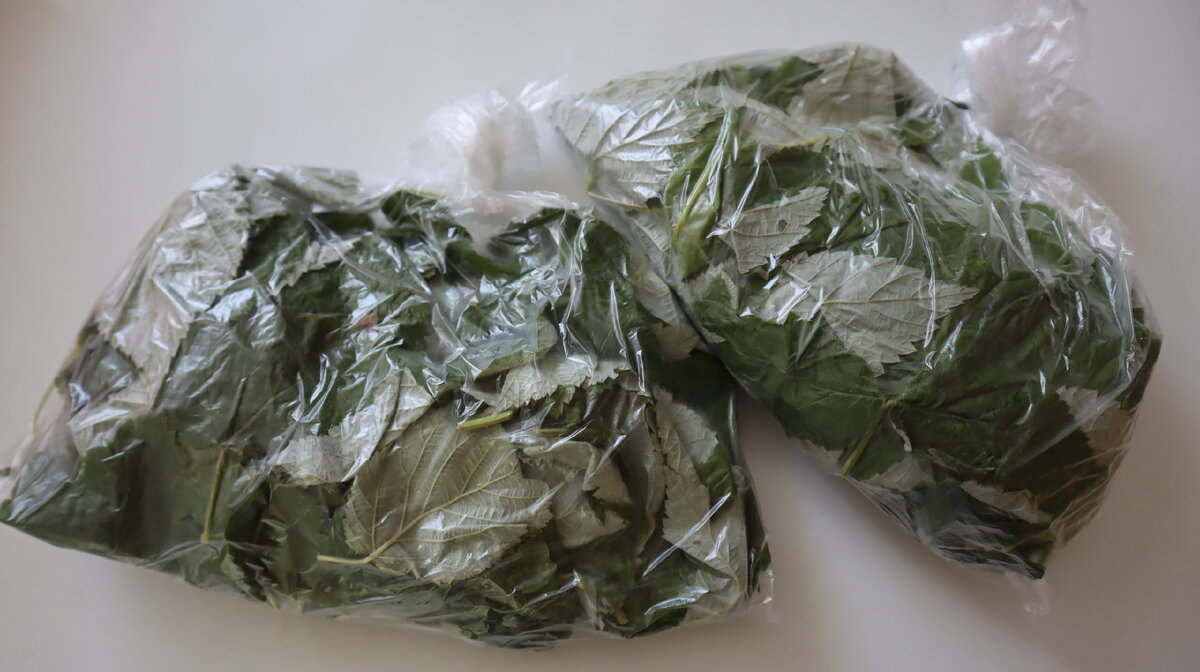 На следующий день открыла банку, на удивление листья остались свежие и переложила их в пакеты, удалила воздух, завязала и заложила их в морозилку ещё на сутки.