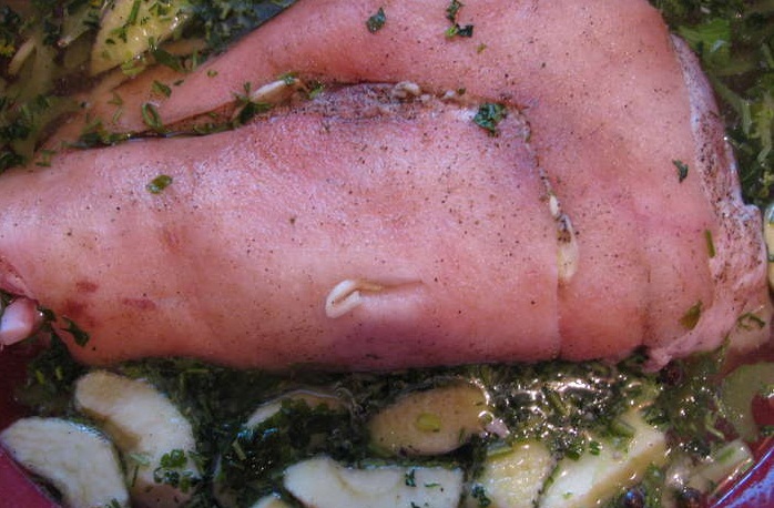 8. Нагреваем духовку до 180 градусов и запекаем до готовности. В зависимости от размера колена, оно будет запекаться приблизительно около 2 часов. Блюдо в процессе готовки можно перевернуть.