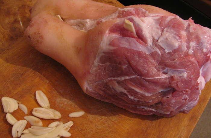 2. Чеснок необходимо нарезать на тонкие пластинки. Таких пластинок у вас должно получится минимум 20. Сделайте равномерные надрезы на рульке и вложите в них чесночные пластины.