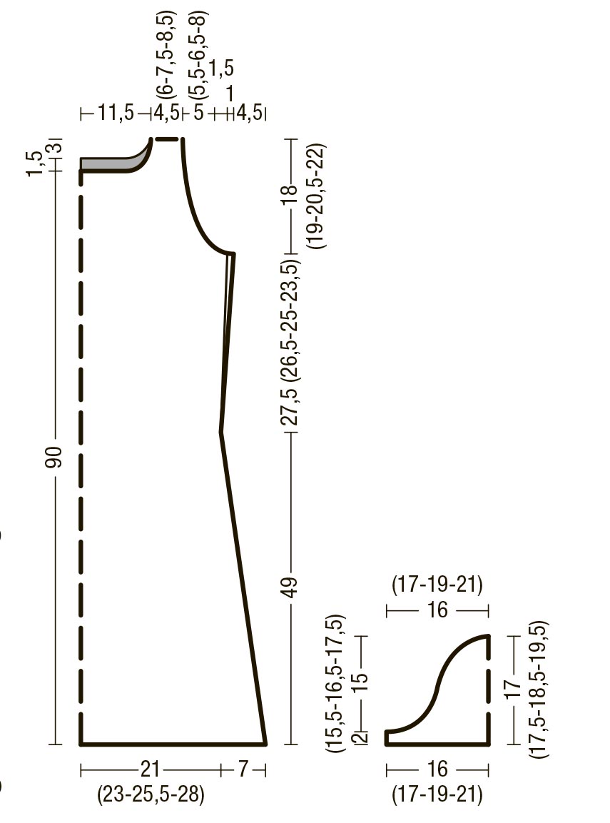 Через 27,5 (26,5–25–23,5) см = 117 (113–107–101) р. от последней убавки, или через 76,5 (75,5–74–72,5) см = 329 (325–319–313) р. от наборного ряда, для пройм с обеих сторон закрыть 1 раз по 2 (2–4–6) п., затем в каждом 2-м р. закрыть еще 2 раза по 2 п. и 9 (10–11–12) раз по 1 п. = 74 (80–86–92) п.