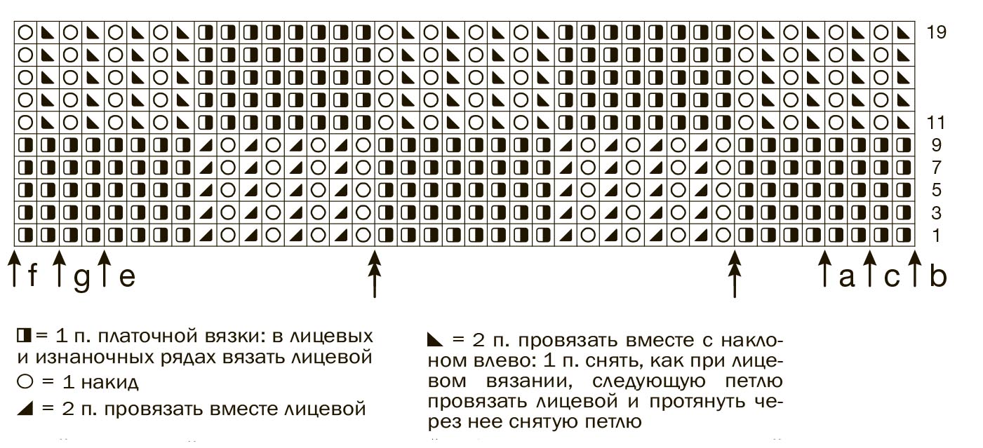Начать с 1 кромочной и 4 (8–6–4) п. от стрелки а (b–c–a) до 1-й двойной стрелки, 7 (7–8–9) раз повторить раппорт = 16 п. между двойными стрелками и закончить 12 (16–14–12) п. от 2-й двойной стрелки до стрелки e (f–g–e) и 1 кромочной.