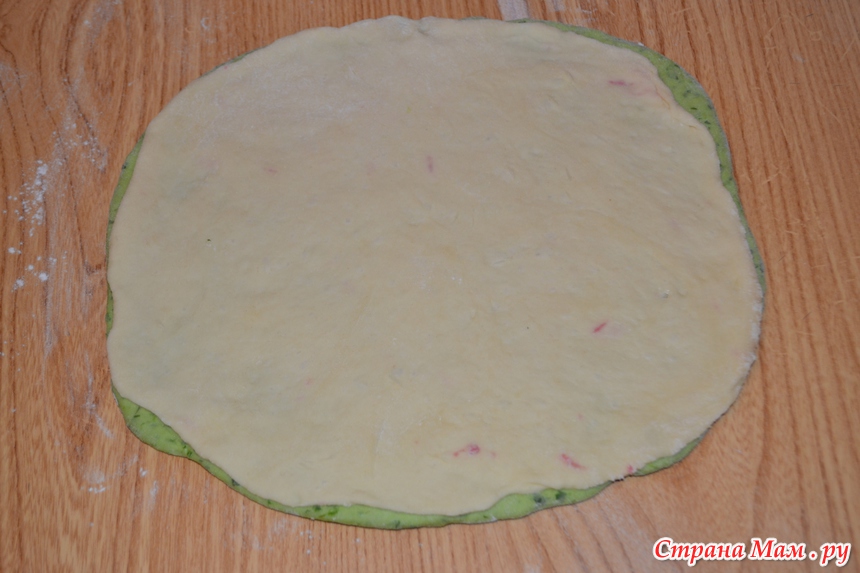 Примерно через час, тесто хорошо поднимется. Белое и зеленое тесто раскатываем скалкой в одинаковые небольшие прямоугольные пласты, красное в толстую колбаску. Затем на зеленый пласт выкладываем белый