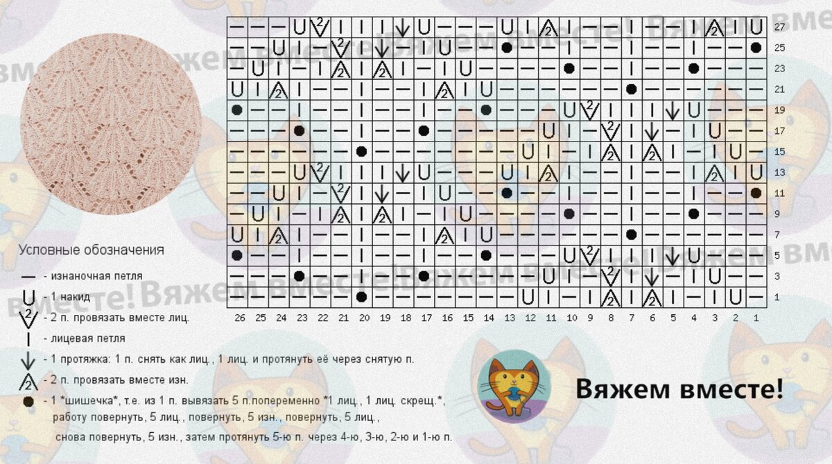 Схема узора. На схеме обозначен один раппорт (26 петель по ширине и 28 рядов по высоте).