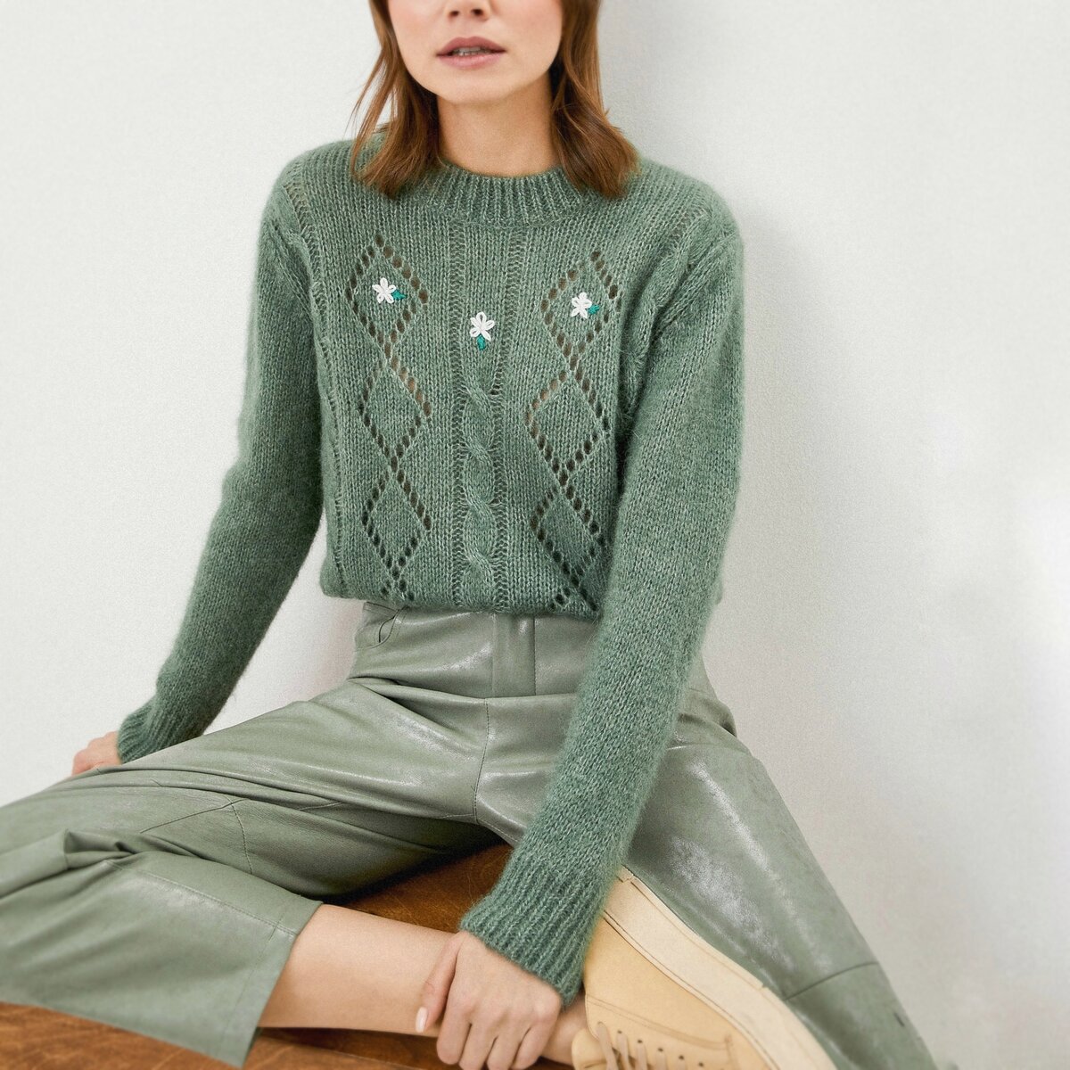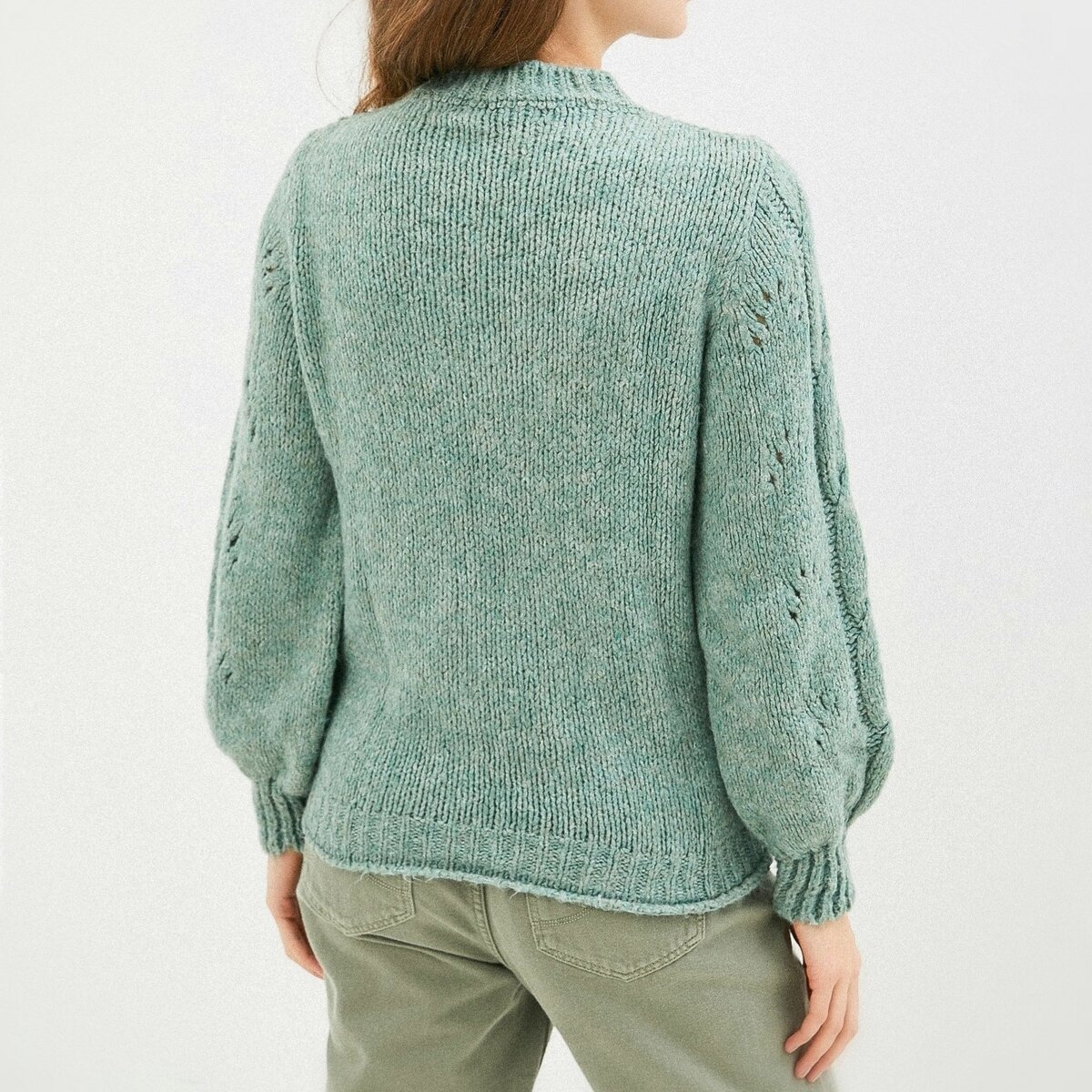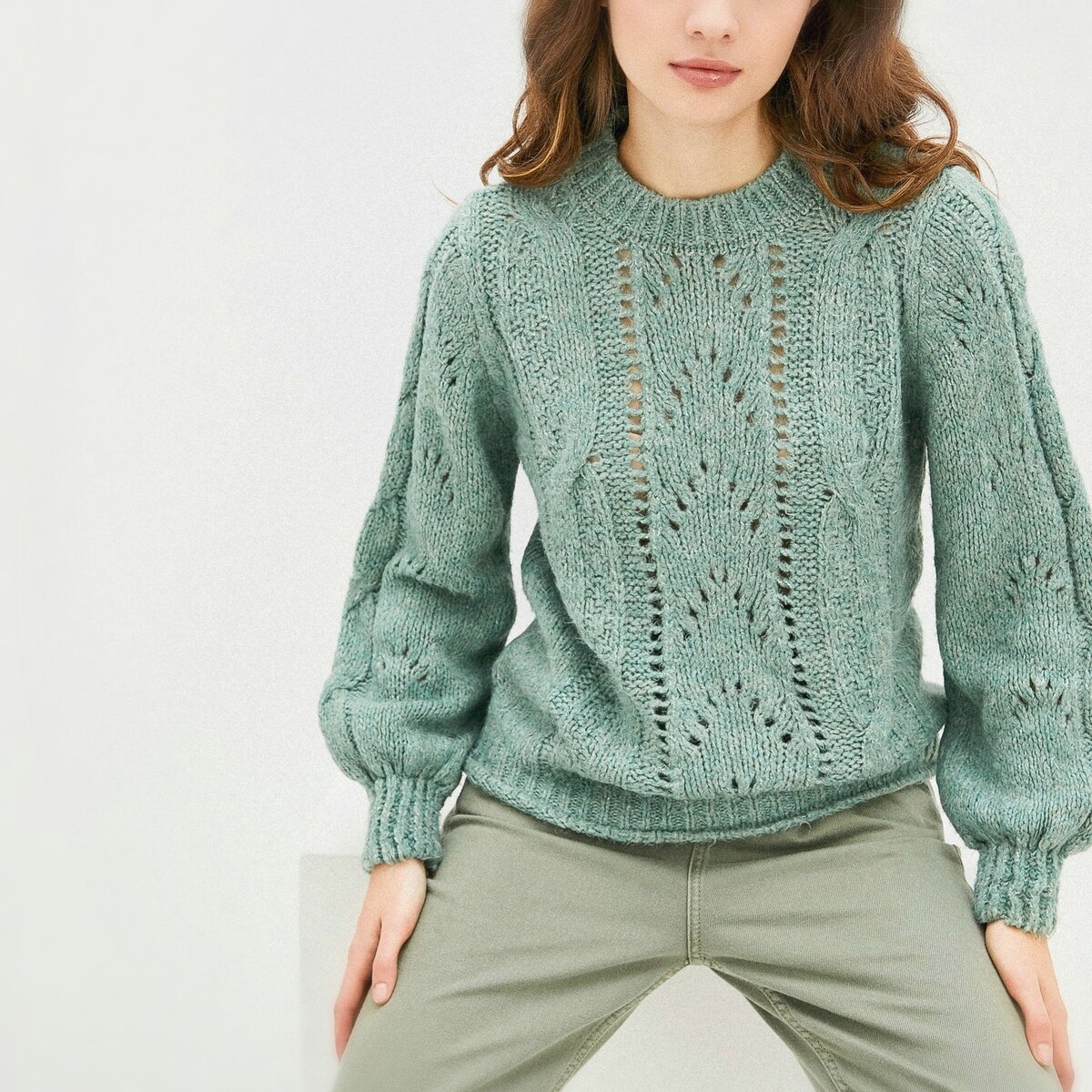 Модель, позаимствованная у Трендиол, — изумрудный джемпер с комбинацией ажурной панели и вертикальных кос.