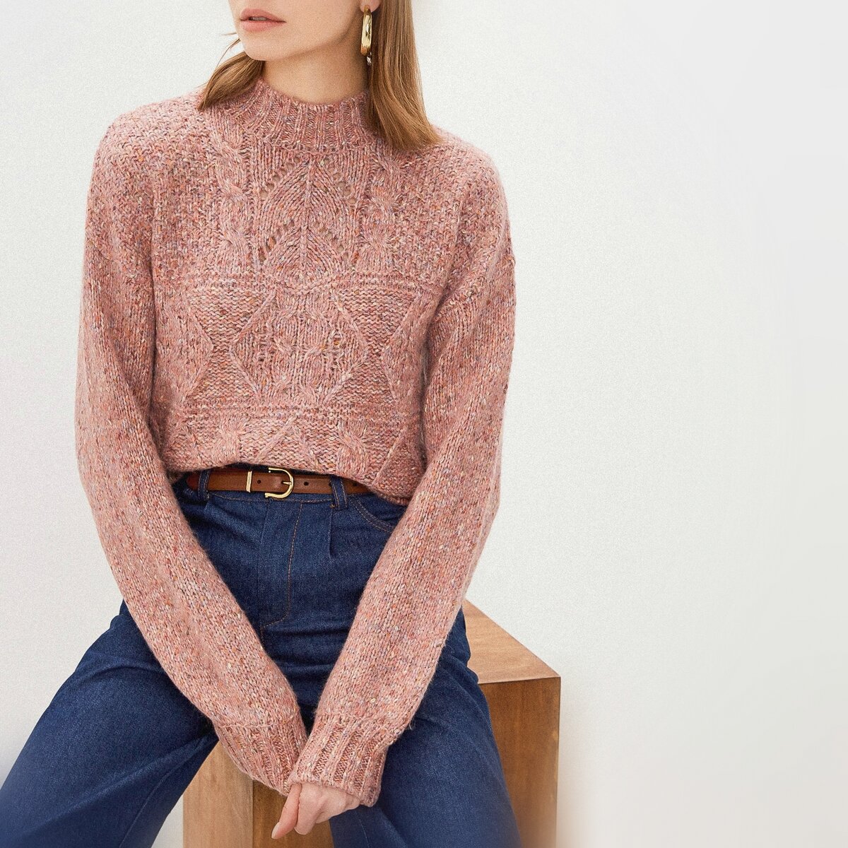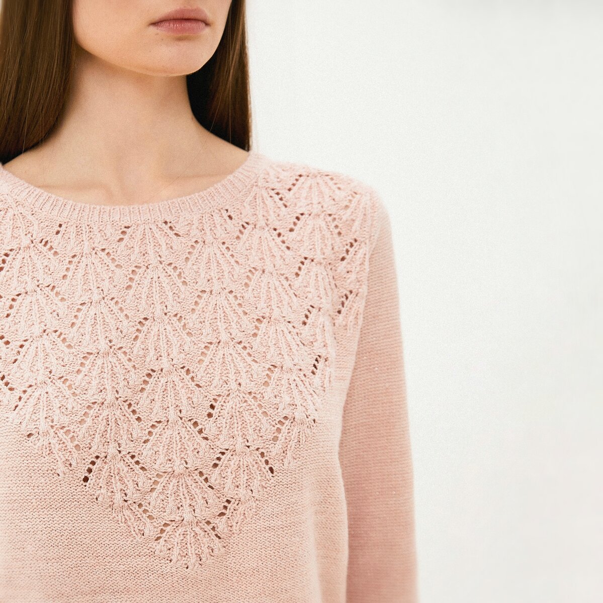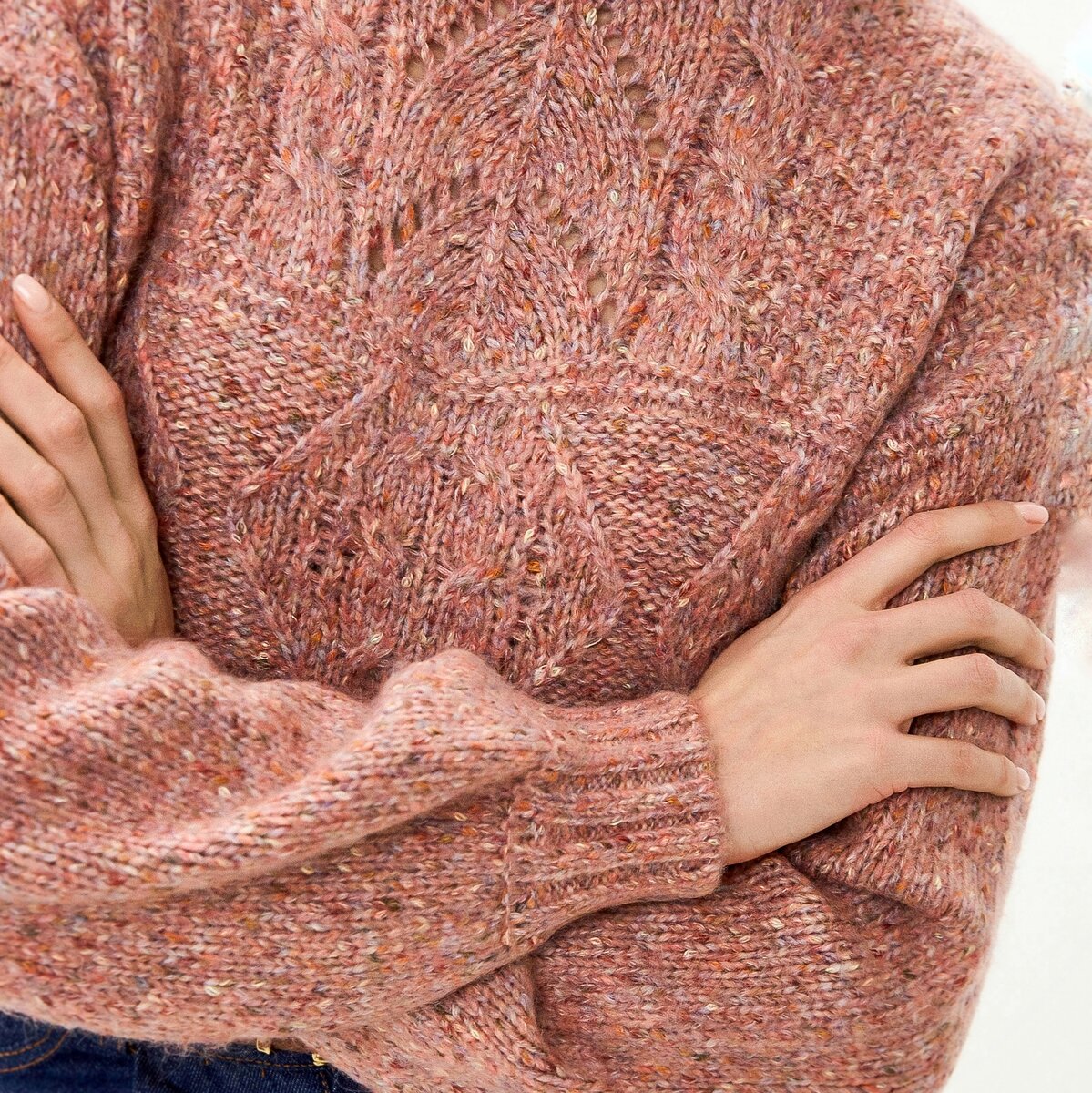 Интересная модель представлена у Спрингфилд, — это джемпер из фасонной меланжевой пряжи в розовом оттенке с комбинацией рельефных и ажурных узоров.