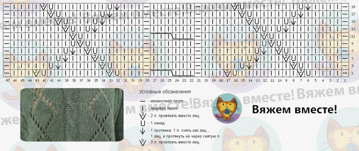 Схема узора. Схеме дана для вязания детали переда. Центральная часть схемы — ажур, по бокам расположены косы с теневым узором "рис".
