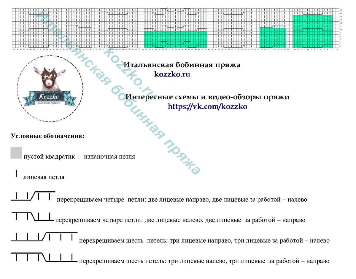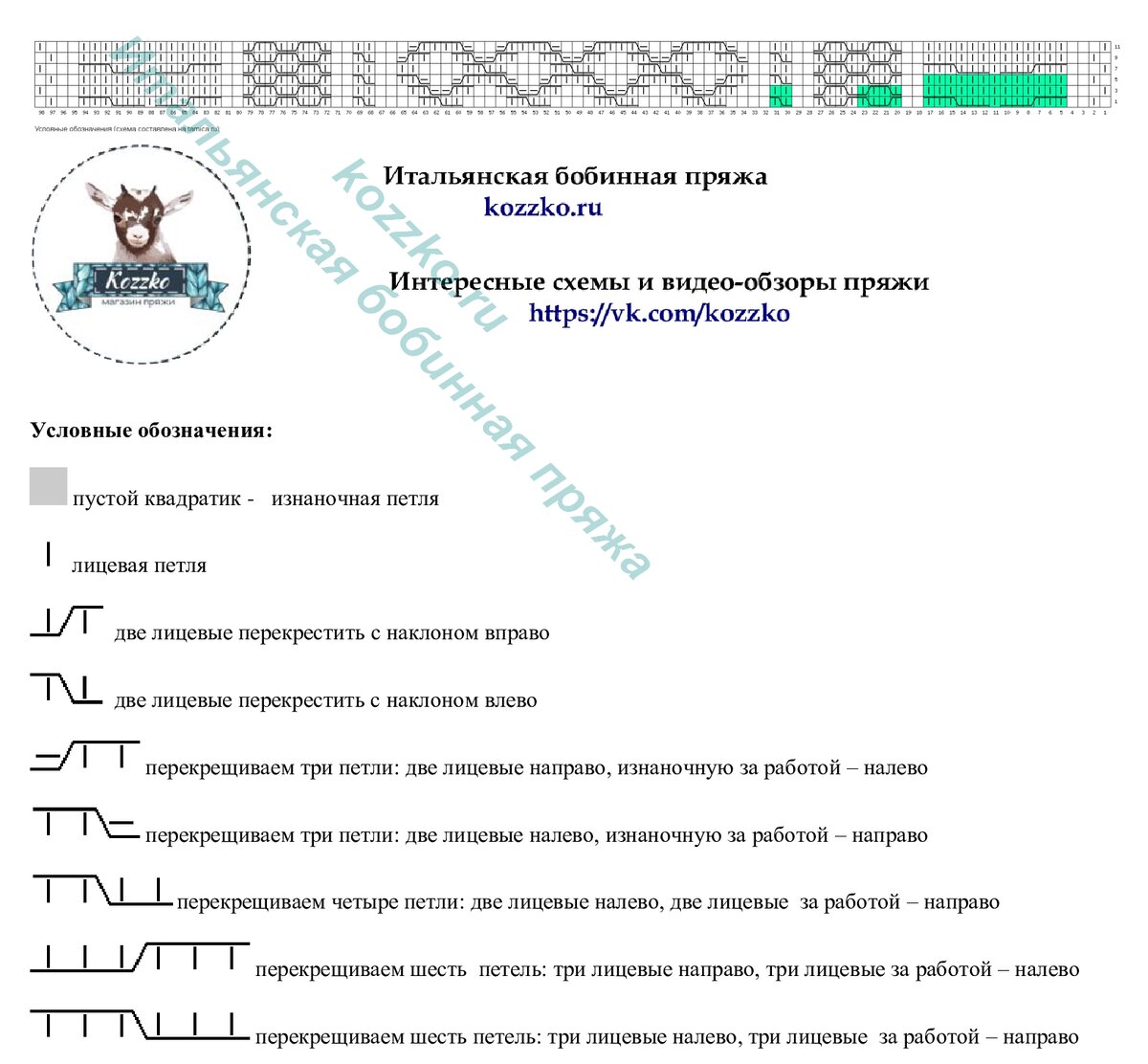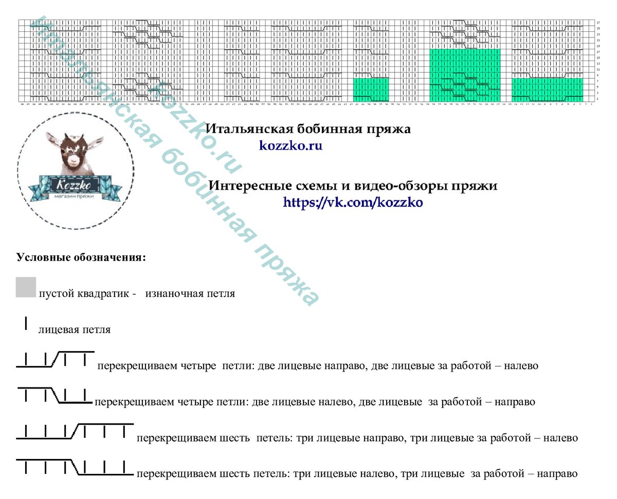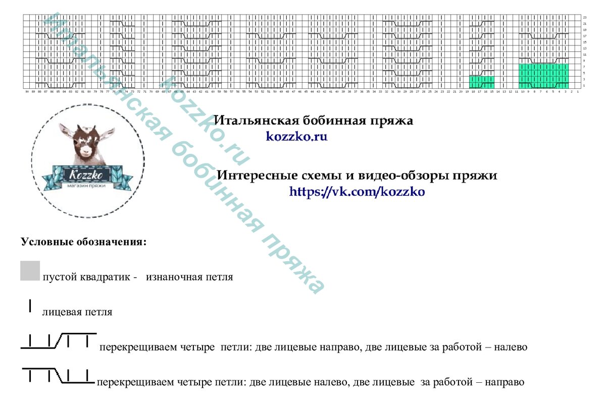 На рисунке - схема узора, раппорты выделены зеленым цветом. Широкие, но относительно плоские жгуты получаются за счет поэтапного перекрещивания петель.
