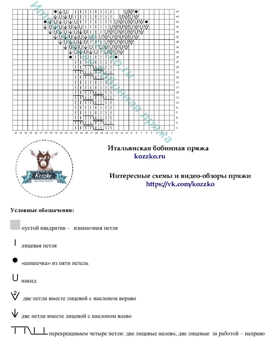 На рисунке - один раппорт узора: 14 петель в ширину плюс одна петля для симметрии. В высоту этот узор вяжется 32 ряда.