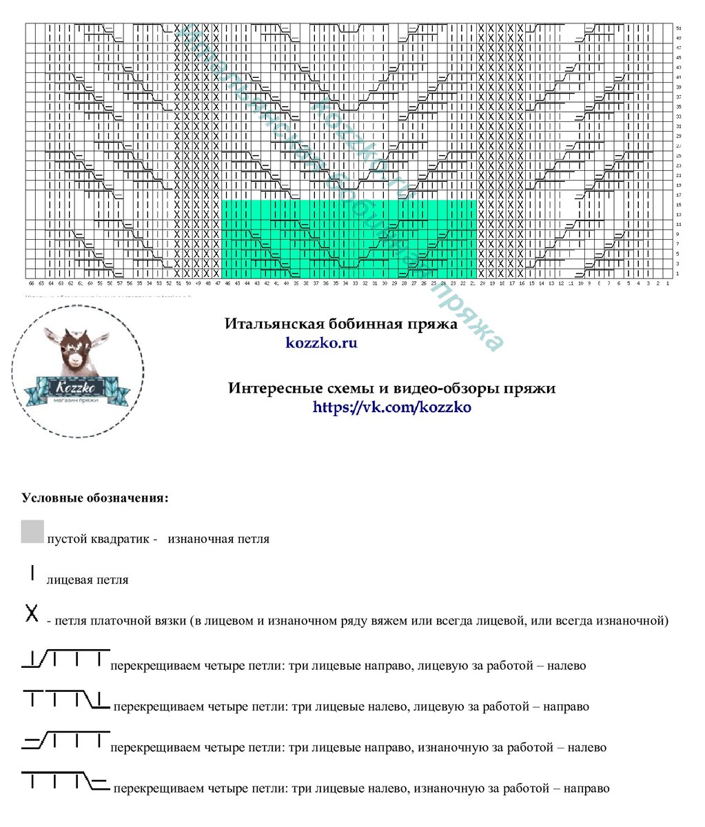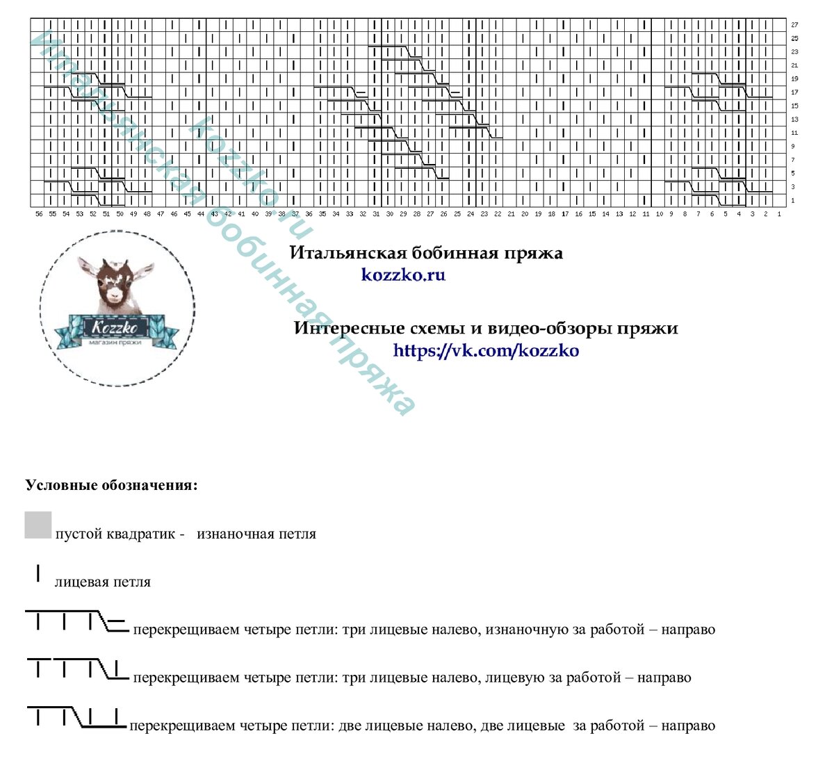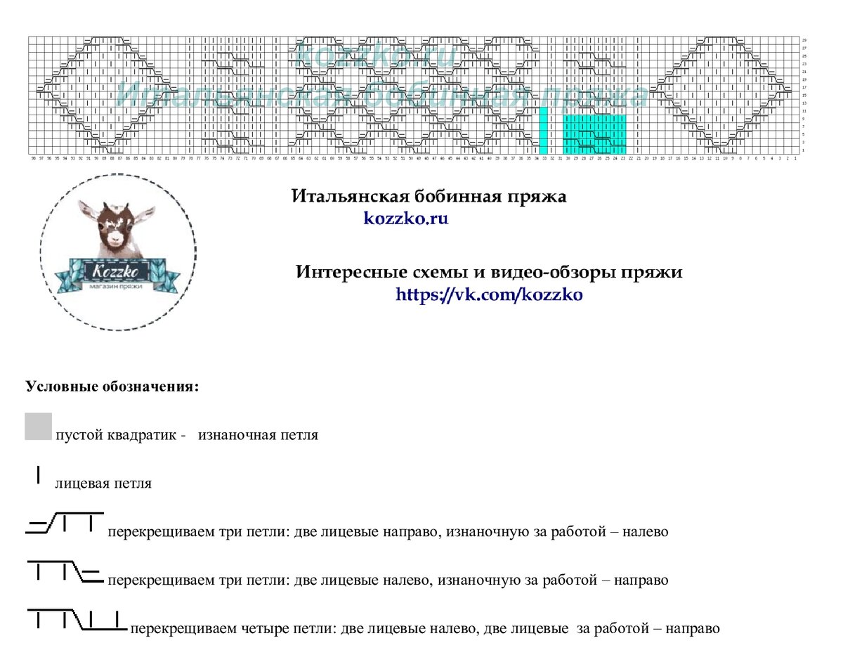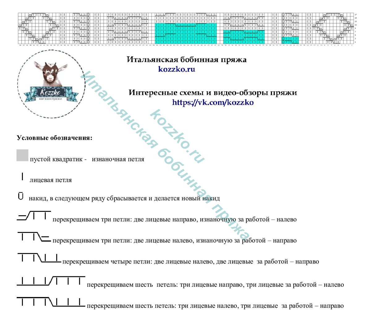 На рисунке - схема вязания, один рапорт узора в высоту (14 рядов) и в ширину (18 петель).