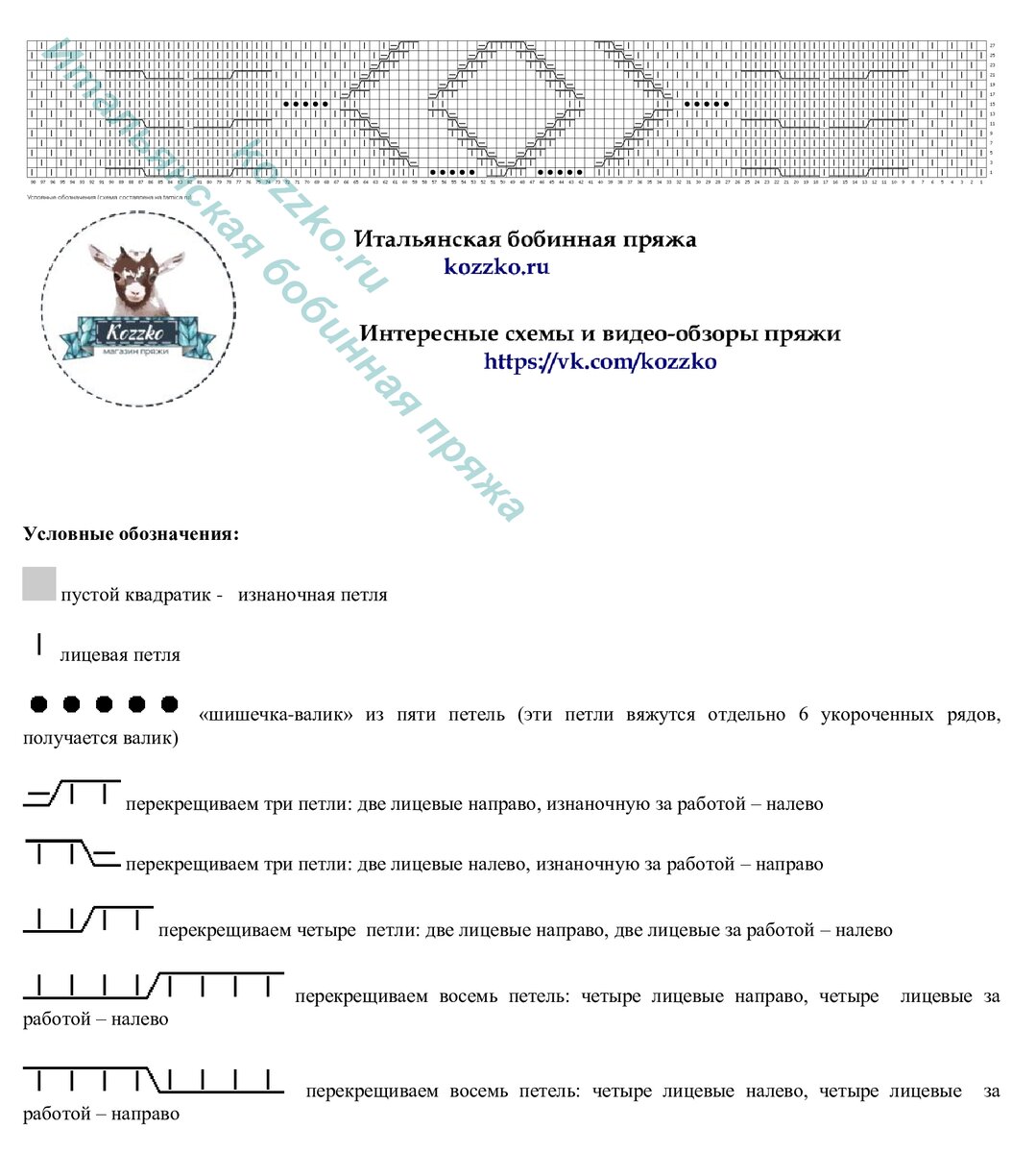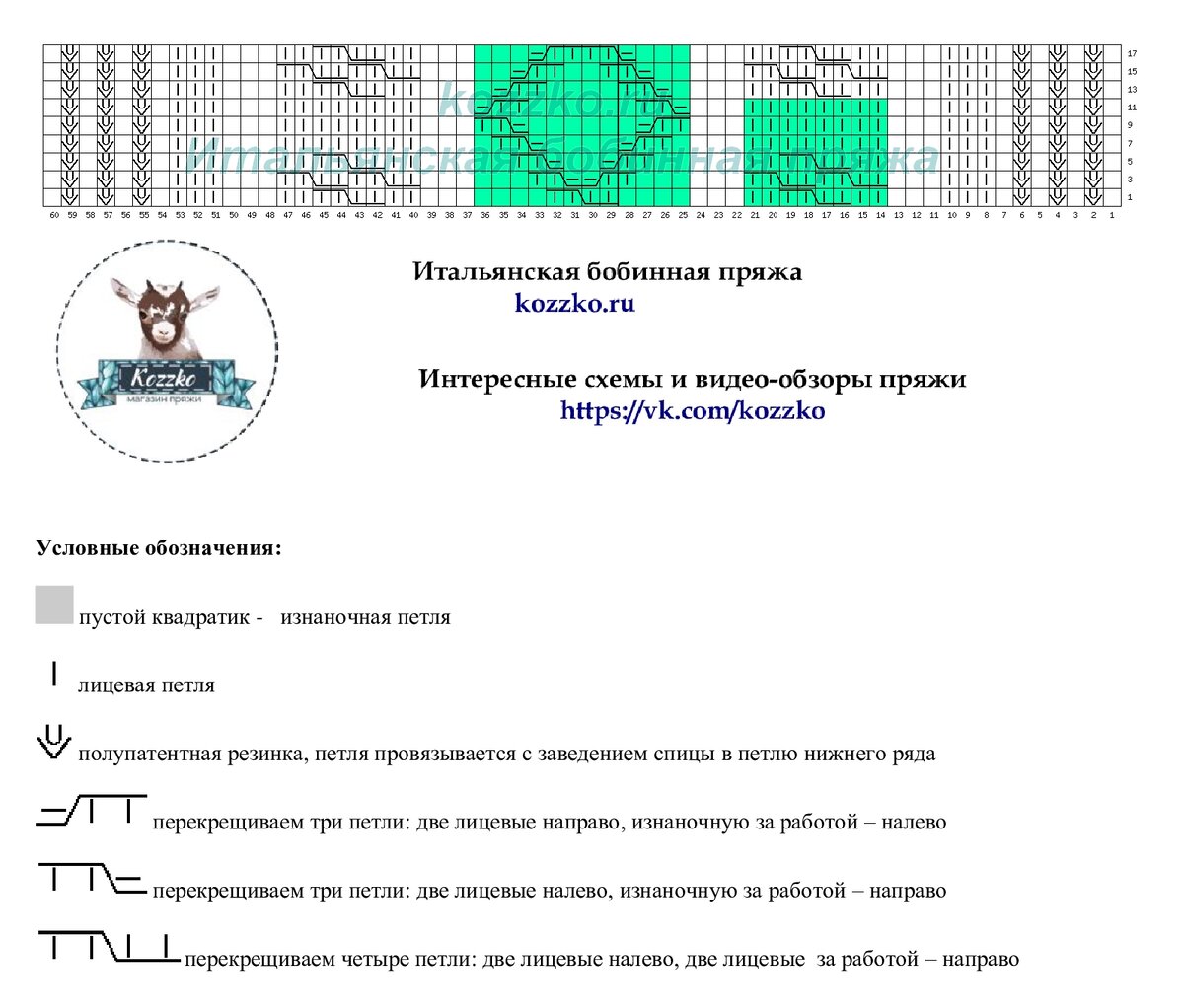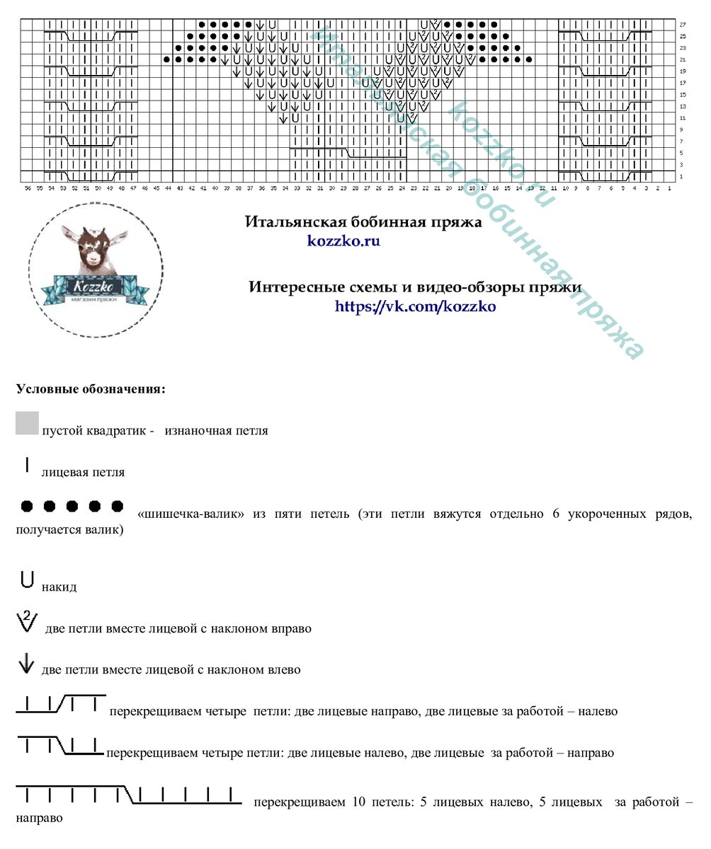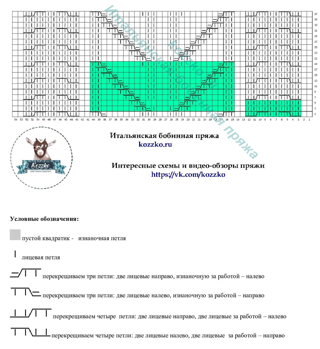 На рисунке - схема вязания, один рапорт узора в высоту (14 рядов) и в ширину (18 петель).