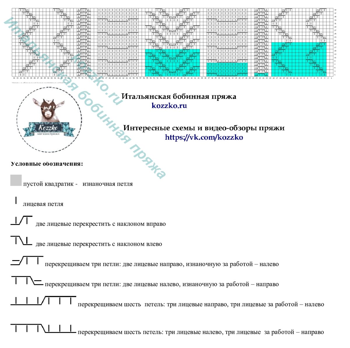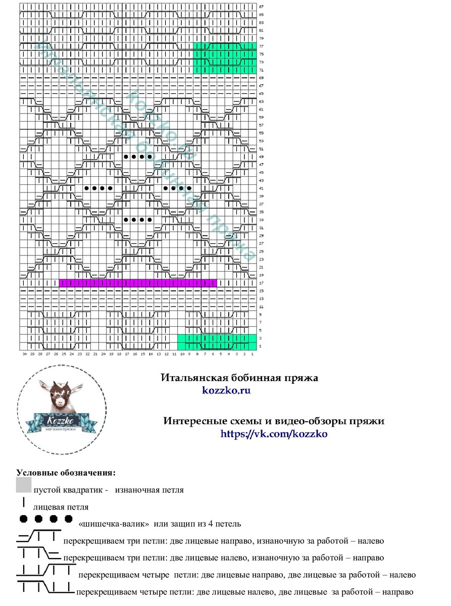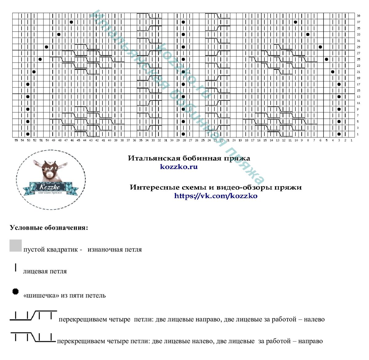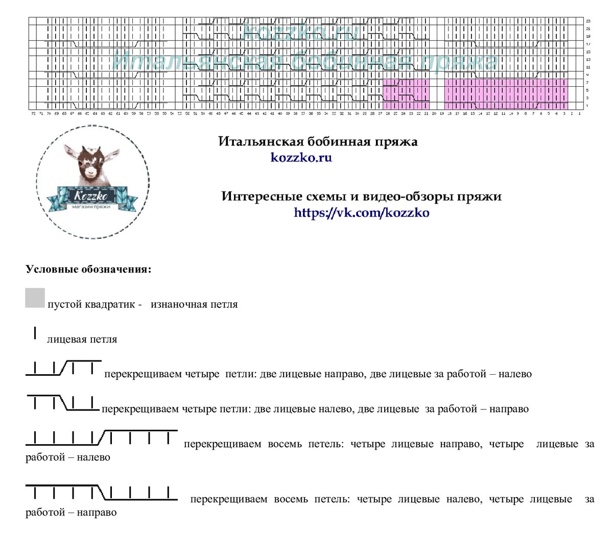 На рисунке - схема узора. По краям не убрался еще один жгут (который на петлях с 13 по 20 и с 71 по 78).