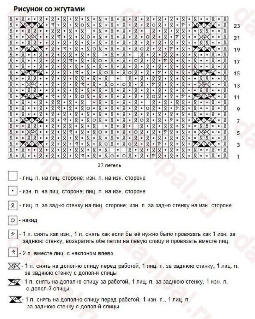 Данный узор относительно широкий, состоит он из 37 петель в длину и 23 рядов в высоту, чем замечательно подходит для украшения передних полочек и спинки изделий.