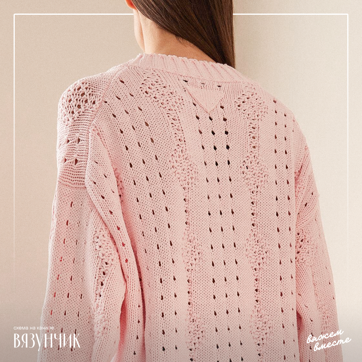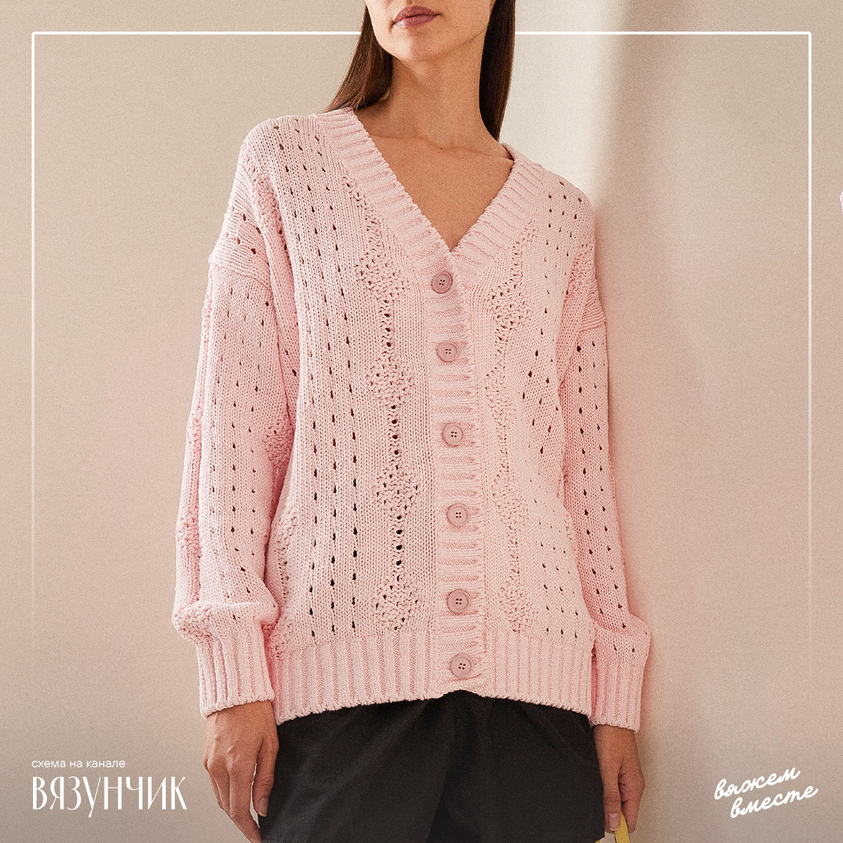 Пуловер укороченный, прямой. Кардиган практически классический, не слишком длинный, но и не короткий. Оба изделия вяжутся снизу вверх.