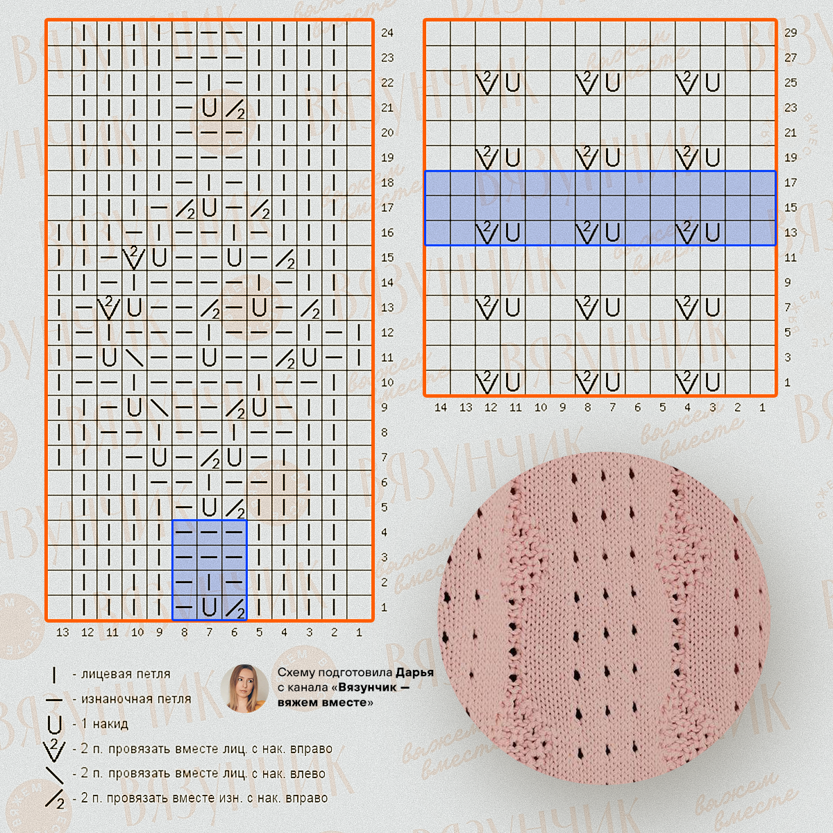 На первой схеме все ряды при вязании по кругу. Если будете вязать поворотными рядами, замените лицевые петли на изнаночные, а изнаночные на лицевые в четных рядах.