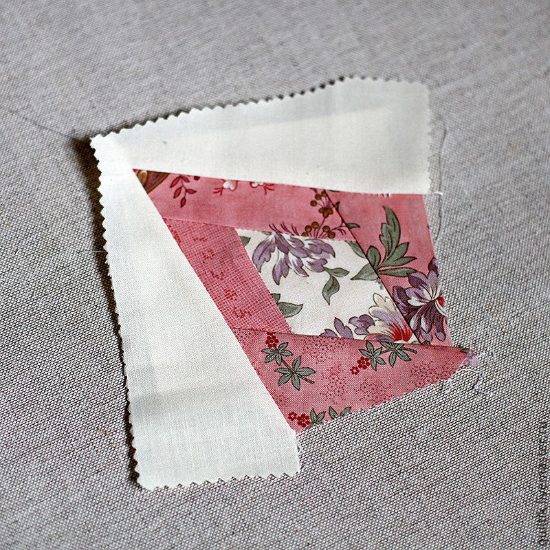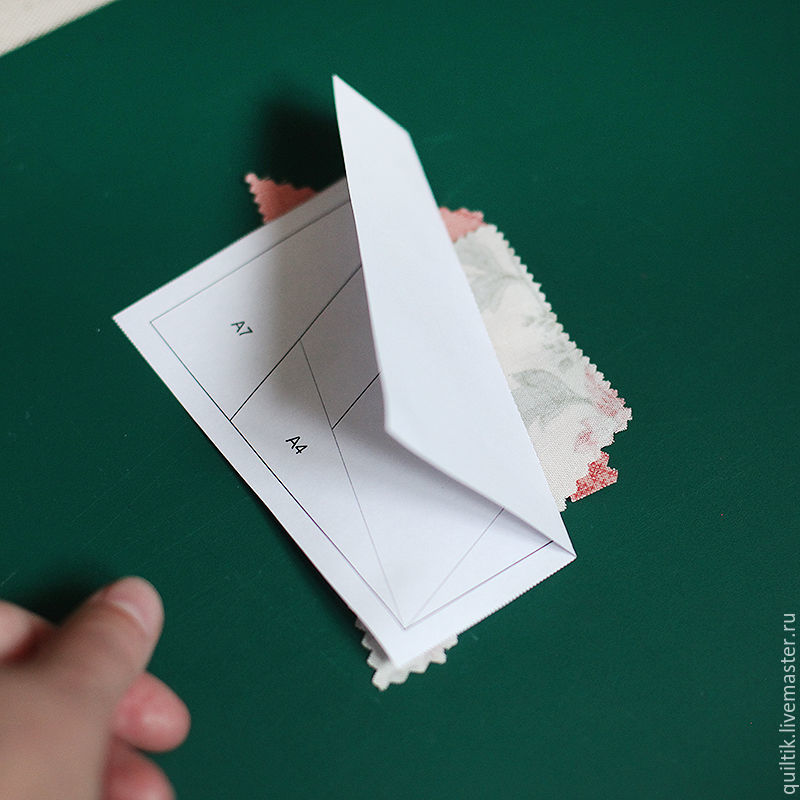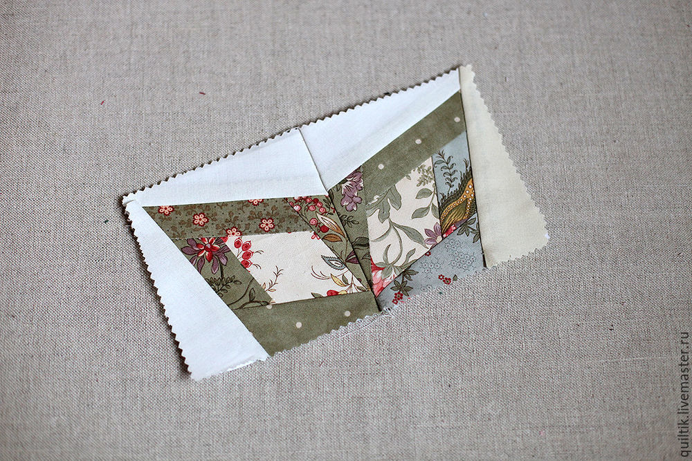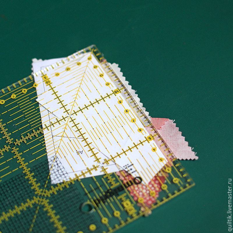 Теперь нужно аккуратно оформить припуски на швы и отрезать лишнее. Для этого отогните бумажный шаблон по границе 1/2. Наши тканевые детальки и бумага останутся по одну сторону от шва. Припуски на швы по другую. Подрежьте припуски на расстоянии ¼ дюйма.