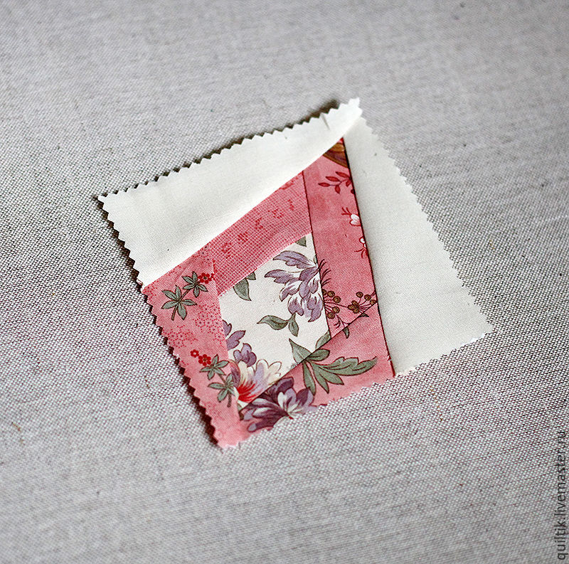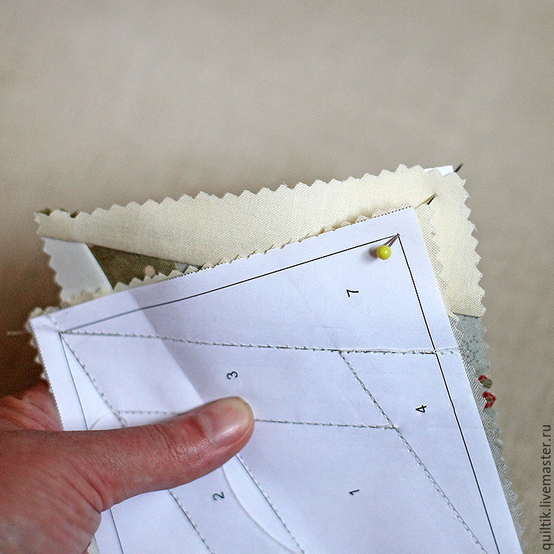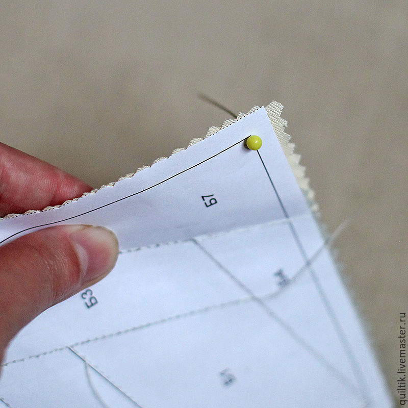 Дальше действуем по аналогичной схеме. Прикалываем деталь 3. Прошиваем по границе 2/3. Подрезаем кромку, отутюживаем.