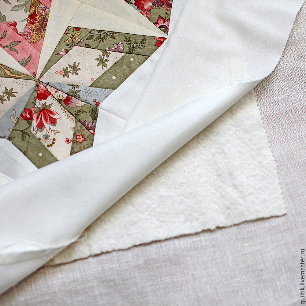 Собрали топ, соберем сэндвич. Для новичков, сэндвич — это трехслойная конструкция (ткань / наполнитель / ткань ). У меня на задней части лен.