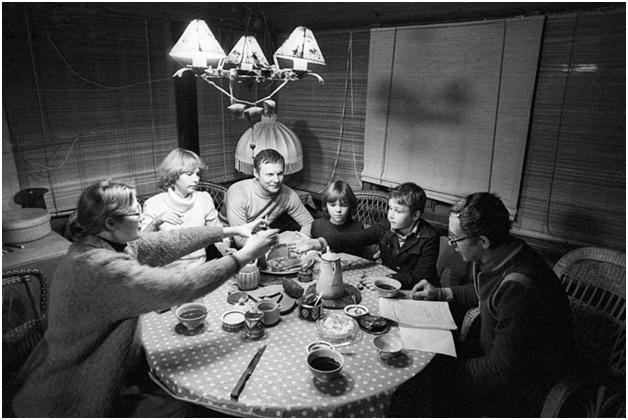 Виталий Соломин вместе с семьей угощает за одним столом заглянувшего на огонек друга Василия Ливанова.