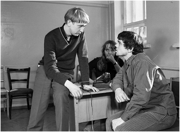 Щукинские студенты 3-го курса Сергей Кашицын, Валентина Лысенко и Константин Райкин обсуждают новую пьесу, которую планируют поставить в стенах училища.