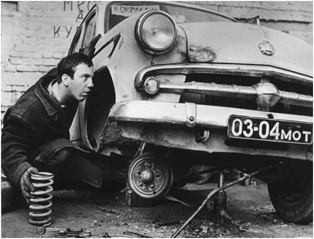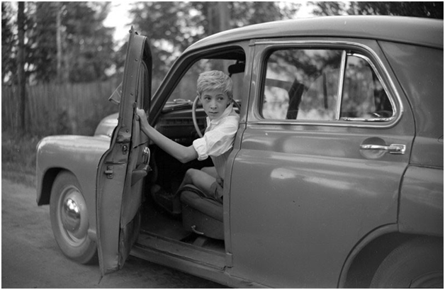Подросток Коля Бурляев, будущий актер и режиссер, с гордостью позирует фотографу за рулем блестящей новенькой «Победы», в которой ему разрешили посидеть.