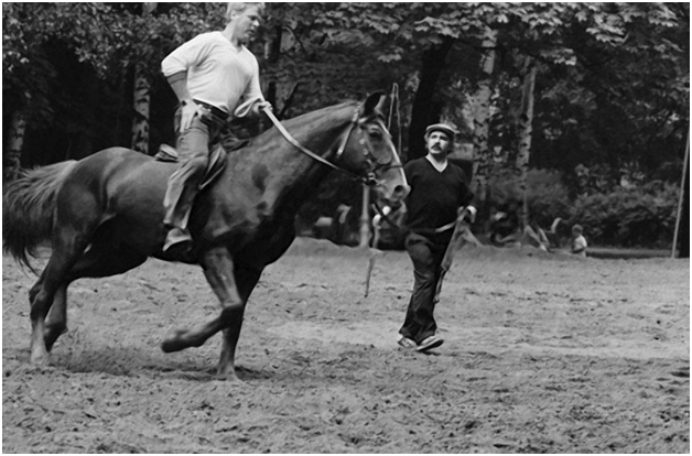 Михаил Кокшенов обучается искусству верховой езды в кооперативе «Ямской двор». На дворе июль 1988 года.