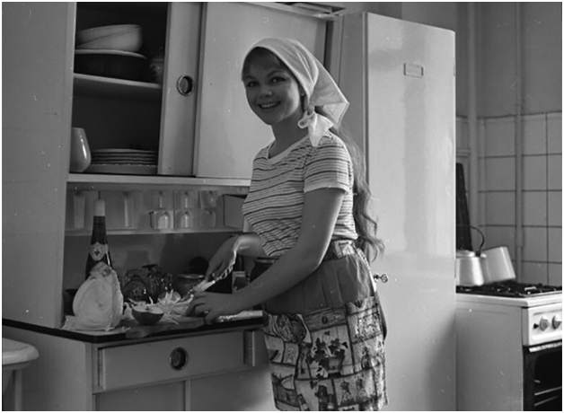 Актриса Валентина Теличкина в домашней обстановке нарезает капусту для кулебяки. Интересно посмотреть, в каких квартирных условиях жили артисты в 1969 году.