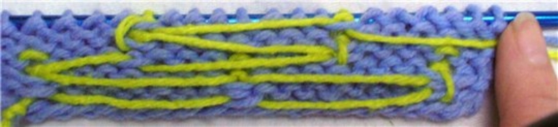 В жаккардовом вязании иногда встречается вариант провязки одной-единственной петли цветом Б, в то время как цвет А заполняет все полотно. Вот эта самая единственная петля довольно сложна в исполнении, так как она шаткая, не имеет поддержки соседних петель того же цвета. Очень важно найти баланс для такой петли- не затянуть и не расслабить. Многие предпочитают вышивать такие одинарные петли, но иногда они являются частью сложного жаккардового узора и если их потом вышивать- то вышитые петли будут отличаться от вывязанных.