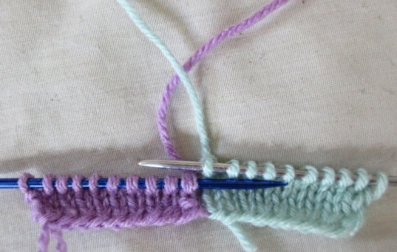 Свяжем сначала наипростейший образец: одна петля--цветом А, другая--цветом Б. Здесь протягивание ниток-минимальное (меньше 1 см) но все же надо побеспокоиться о том, чтоб лишнего не стянуть и не расслабить вязание.