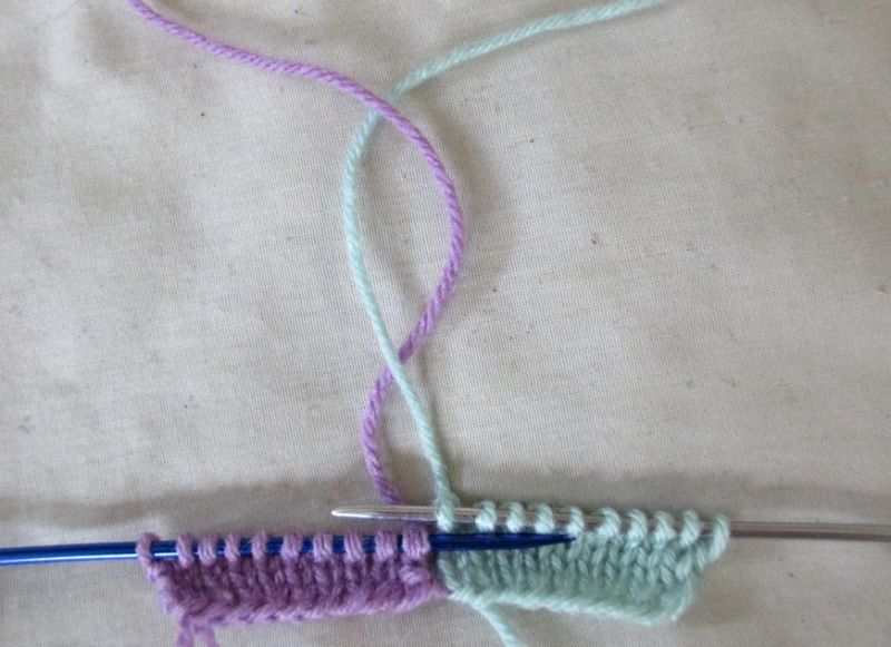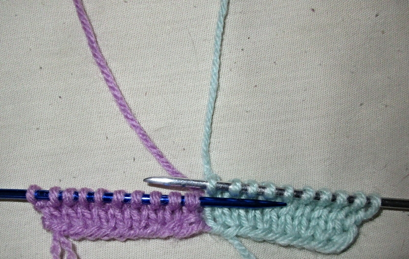 В том случае если пряжа не очень толстая- лучше провязывать краевые петли нитками обеих цветов. Края будут очень ровными и аккуратными.