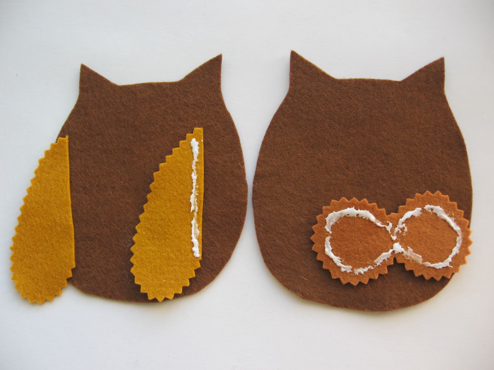 Подбираем желаемое цветовое сочетание фетра и вырезаем из него две детали туловища, две детали крыльев, одну сдвоенную деталь глаз (ножницами зиг-заг), две детали глаз другого цвета, небольшие треугольнички для ушей и носа, еще я добавила произвольную фигурку - хвостик, а из ткани вырезаем ножницами зиг-заг детальку брюшка.