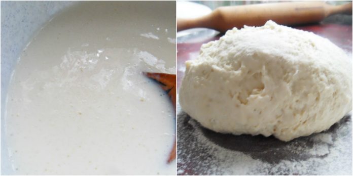 Муку просей и добавь в жидкую массу. Вымеси мягкое тесто. Если понадобится, добавь еще немного муки. Допустимо, что тесто будет слегка липнуть к рукам. Присыпь его мукой и, накрыв полотенцем, оставь расстаиваться на 10 минут.