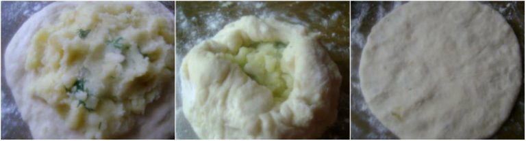 Тесто для лепешек скатай в жгут и нарежь на 8–9 частей. Кусочки раскатай, слегка присыпая мукой, в лепешки толщиной с мизинец. По центру выложи заранее подготовленную начинку, защипни края, прижми и разровняй немного рукой. Снова оставь на 2–3 минуты.