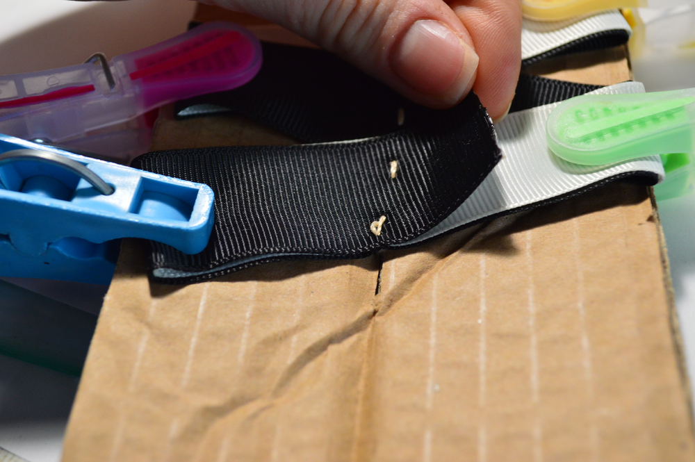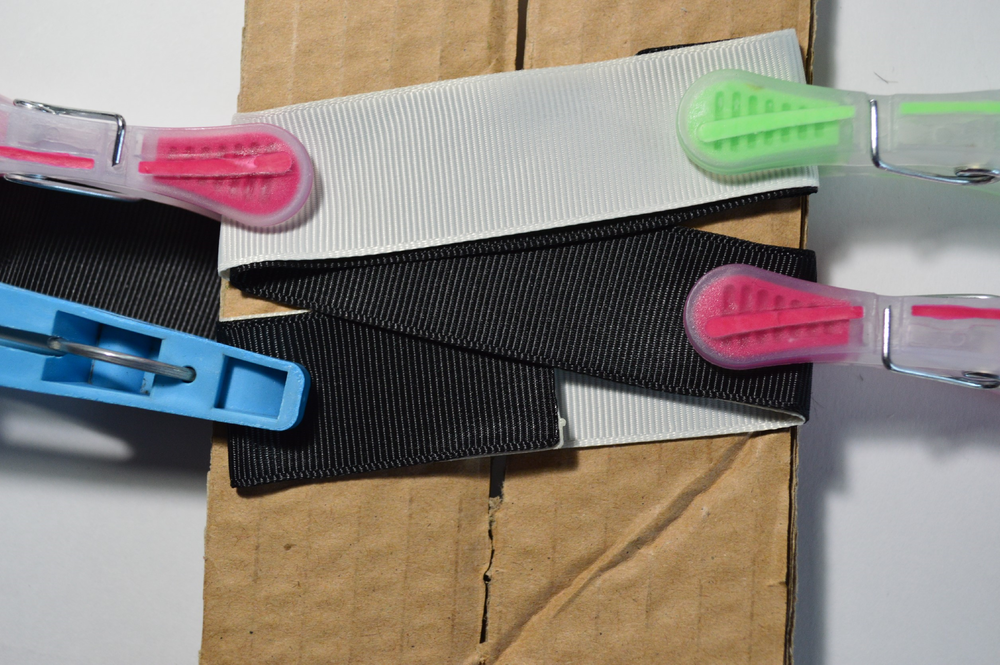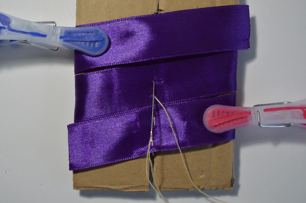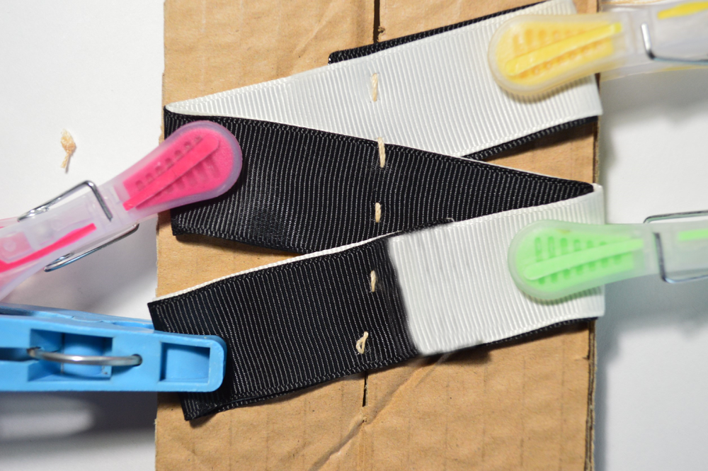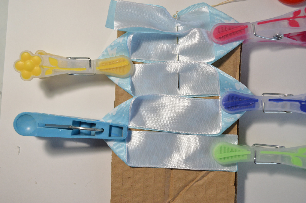 - Для удобства можно использовать прищепки и картонную форму для бантиков с вырезом в середине.