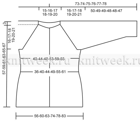 Далее выполнить 4 ряда платочным вязанием на оставш. 143-143-143-163-163-163 п., при этом в 1-ом ряду равномерно убавить 43-37-31-45-39-33 п. Закрыть петли.