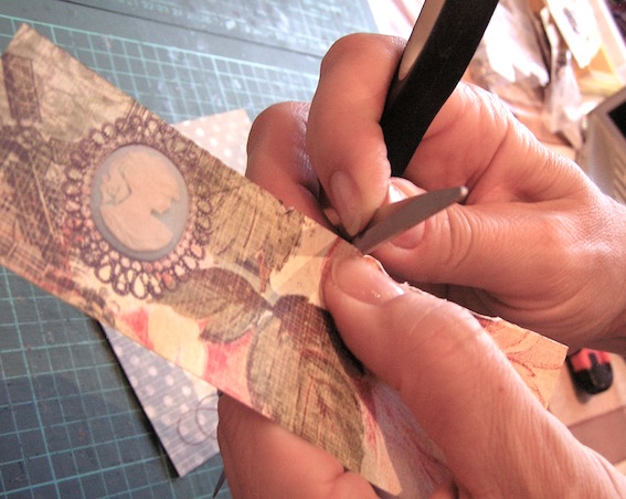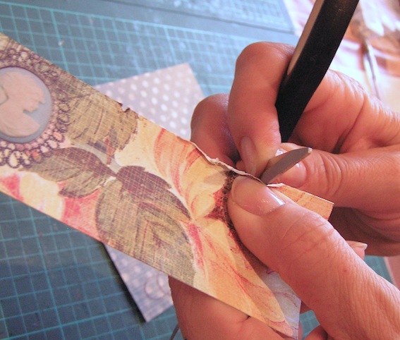 Берем полоску бумаги 5 х 15 см, отличающуюся от фоновой, ножницами создаем замятие верхнего и нижнего краев, так называемый "рваный край с отгибкой". Желательно, чтобы ножницы были не очень острые.