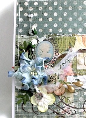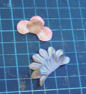 Можно использовать капроновую сеточку для придания воздушности цветочной композиции. Сначала ее можно "прихватить" складками на клей, а потом пристрочить. Далее в маленькую лужицу клея (я использовала "Тайфун"- из разряда клеев для потолочной плитки) помещаем розочки-бутоньерки, тычинки, подвесочку, накрывая это крупным цветком. Затем добавляем плоские цветы (по желанию), помещая в серединки розочки, полубусины или то, что считаете нужным.