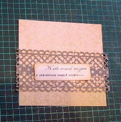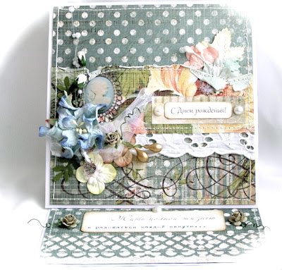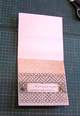 Добавляем тонированную надпись, к примеру, "С Днем рождения!", "крепим" ее полубусинами. Затем приклеиваем готовый верх открытки к основе из дизайнерского картона.