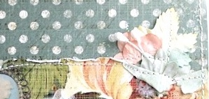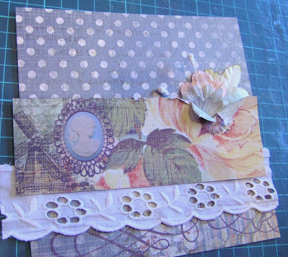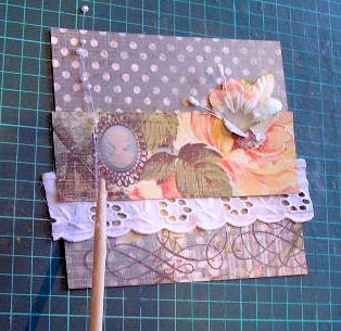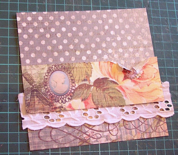 Затем начинаем пристрачиваем полоску, можно также пристрочить и цветочно-лиственную композицию. Излишки кружева и полоски обрезаем по периметру. Проходим машинкой и по периметру фоновой бумаги.