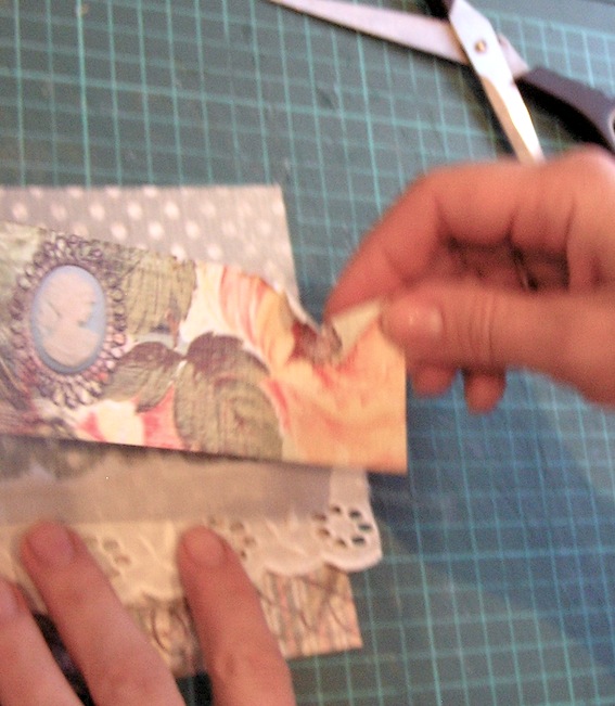 Приклеиваем полоску бумаги с рваными краями на кружево таким образом, чтобы кружево на 1 - 1,5 см выглядывало из под ее нижнего края.