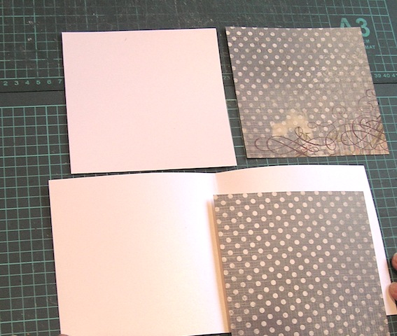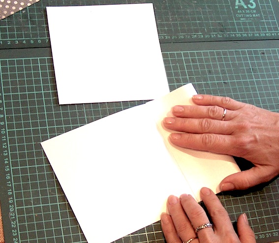 Приклеиваем к этой детали (7,5 х 15 см - на нее наносим клей) квадрат из дизайнерской бумаги (15 х 15 см), соединяя их нижние края.