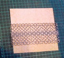 Берем квадрат фоновой скрап-бумаги и на расстоянии 1/3 от нижнего края приклеиваем кружево. Клей наносим точечно на бумагу очень тонким слоем, чтобы он не пропитал кружево.